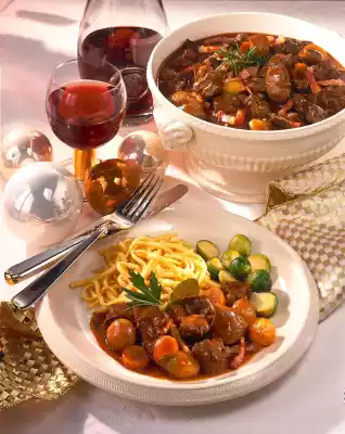 Season with salt and pepper. Add carrots and shallots. Dust with flour. Add tomato paste, fry briefly and deglaze with red wine. Pour in broth. Crush juniper berries and add to the ragout with bay leaves.