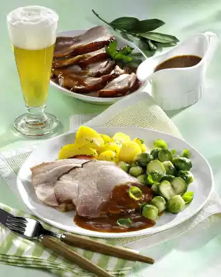 Brush the roast with it after 1 hour. Peel, wash and cut the potatoes into pieces. Cook in boiling salted water for about 20 minutes. Clean and wash the Brussels sprouts and cook in boiling salted water for 12-15 minutes.