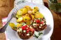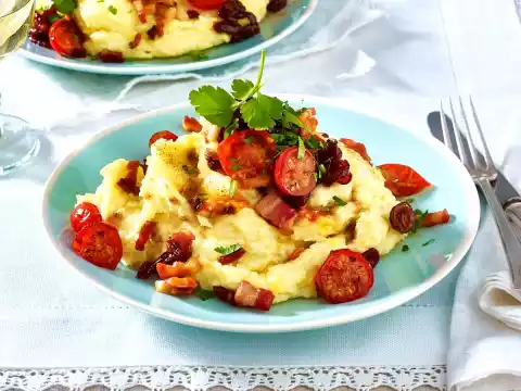 Drain the potatoes. Add milk and 3 tablespoons of butter and mash everything coarsely. Season the puree with salt and nutmeg. Arrange mashed potatoes with bacon, onions and tomatoes.