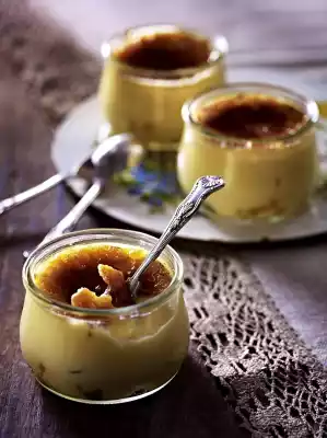 Dice the ginger finely and divide into 6 small bowls. Pour cream into the moulds as well. Chill for 2 hours. Sprinkle cream with brown sugar. Caramelise the sugar with a gas burner