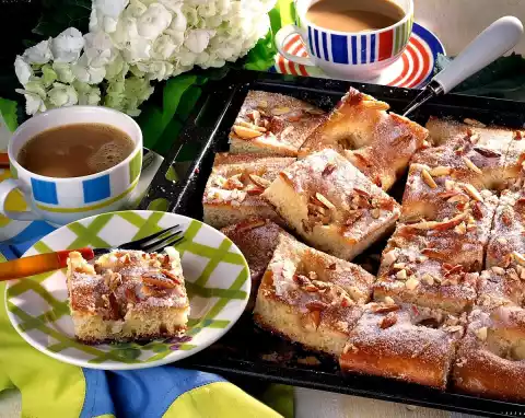 Cover the baking tray with the dough and let it rise for another 15-20 minutes. Press the remaining butter in flakes into the dough. Bake in the preheated oven (electric: 175 °C/ gas: level 2) for 30-35 minutes. In the meantime chop the almonds coarsely. Roast in a pan without fat until golden brown. 10 minutes before the end of the baking time, spread remaining sugar and almonds on the cake. Let it cool down