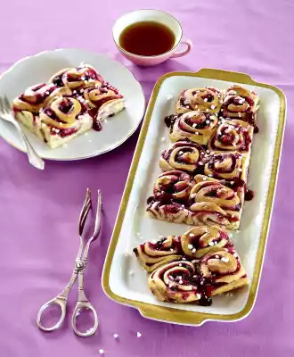 Line a baking tray (32 x 39 cm) with baking paper. Knead the yeast dough again and roll out on a floured work surface rectangularly in the size of the baking tray. Spread the dough with the red fruit jelly and roll up from the long side. Cut into 24 slices of approx. 1.5 cm thick and place them on the baking tray with the cut surface next to each other. Cover and leave to rise in a warm place for about 15 minutes. Sprinkle with decorating sugar and bake in a preheated oven (electric cooker: 175 °C/ convection oven: 150 °C/ gas: see manufacturer) for approx. 25 minutes. Take the cake out of the oven and let it cool down