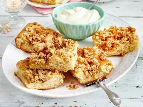 Knead the dough again. With floured hands spread on the greased fat pan (approx. 32 x 39 cm). Cover and leave to rise in a warm place for about 15 minutes. Spread 150 g butter in pieces and crumbles on the dough. Bake in the preheated oven (electric cooker: 175 °C/circulating air: 150 °C/gas: see manufacturer) for approx. 30 minutes. Let it cool down.