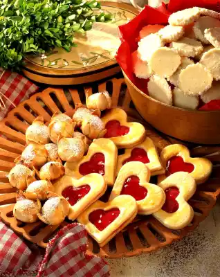 Bake in a preheated oven (electric: 175 °C/ gas: level 2) for 12-15 minutes. Let the cookies cool down on a cake rack. Heat the jelly and spread a thin layer on the whole hearts. Place the perforated hearts on top and fill with the remaining jelly. Let them set. This pack contains approx. 9 jelly hearts, 30 butter-sugar cookies and 20 butter Bethmännchen