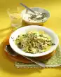 Mix curd, sour cream and milk. Peel, chop and add garlic or press it directly into the quark. Wash the herbs. Chop the parsley, cut the chives into small rolls. Stir both into the quark, season