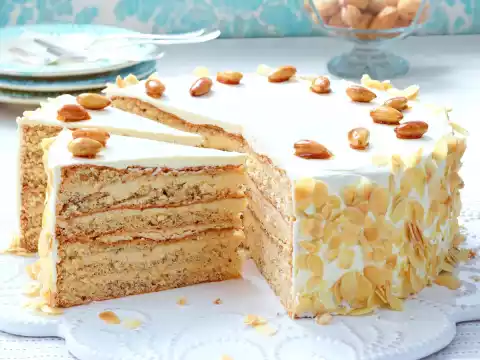 Spread 1/5 of almond cream on a sponge cake base, place the 2nd sponge cake base on top, press down lightly and work 4 more layers in the same way, finishing with the top layer (5 layers of almond cream and 6 layers of sponge cake). Chill the cake for at least 30 minutes