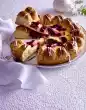 Whip 150 g butter and 25 g icing sugar until creamy white and coat the cake with it. Lightly press the flaked almonds to the edge and decorate with the almonds that have been set aside. Refrigerate the cake again for about 15 minutes (tastes best if it is not too cold). Cut the cake into pieces with a warm knife