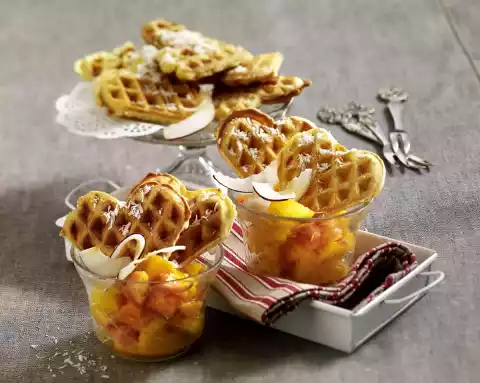 Share waffles in hearts. Fill fruit salad into glasses and arrange with the waffle hearts. Decorate with coconut. Add the remaining waffle hearts.