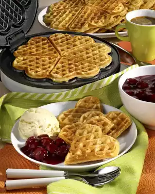 Stir in butter vanilla flavour. Alternately mix flour with milk and sour cream into the dough. Preheat waffle iron, spread with oil and bake 10 waffles one after the other. Divide the waffles into hearts and serve with cherry compote and vanilla ice cream.