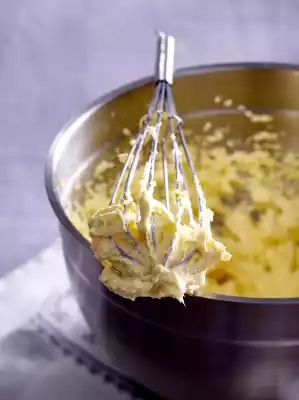 Whip the butter until light and creamy. Stir in the egg-sugar mixture in portions. Continue stirring until smooth.