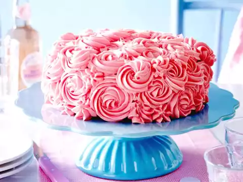 Spray pink butter cream all around the cake in rose/tuffs. Chill the cake for about 2 hours.