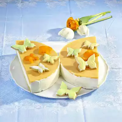 Bake in the preheated oven (electric range: 200 °C/ convection oven: 175 °C/ gas: level 3) for 8-10 minutes. If necessary, remove the butterflies from the oven a little earlier. Let them cool down. Place a cake ring around the base. Drain the apricots, set aside about 4 halves and puree the rest. Soak the gelatine in cold water. Mix yoghurt, 100 g sugar and lemon juice. Stir 4 tablespoons of cream into the apricot puree. Squeeze out 8 sheets of gelatine, dissolve carefully and mix with some yoghurt cream. Stir the gelatine mixture into the remaining cream. Beat 250 g cream until stiff, fold in. Pour cream onto the base and smooth it down. Chill for about 1 hour. Squeeze 4 sheets of gelatine, dissolve carefully and stir into the apricot cream. Pour onto the yoghurt cream and smooth it down. Chill for approx. 2 hours. Stir icing sugar with egg white to a smooth glaze. Divide the icing into three.