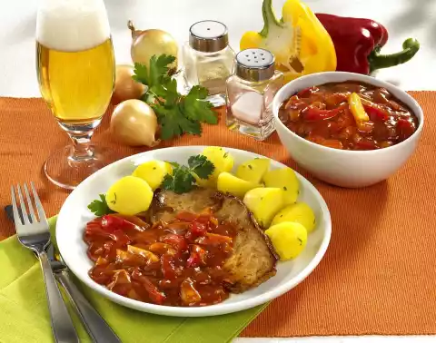 Add onion and paprika to the pan and fry for about 5 minutes. Stir in tomatoes, bring to the boil. Season with salt, pepper and sweet paprika. Refine with cream. Drain the potatoes. Arrange everything and sprinkle with parsley