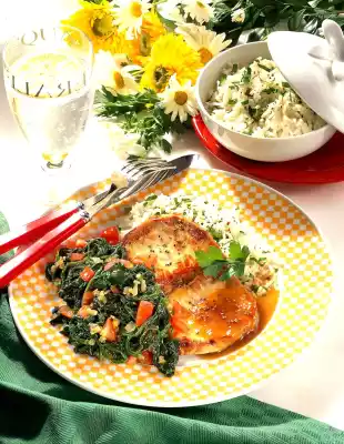 Mix rice and parsley and arrange on plates together with the steaks, sauce and spinach. Serve garnished with parsley.