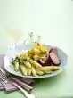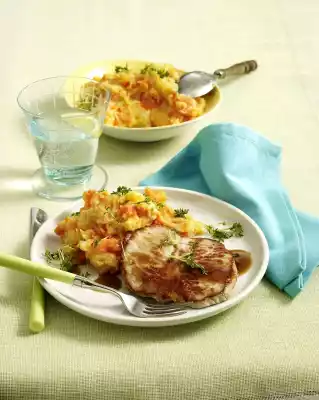 Drain the potatoes and carrots, leaving about 100 ml cooking liquid in the pot. Add sour cream and butter and crush everything coarsely. Season to taste with salt and nutmeg. Rinse cress and cut from the bed.