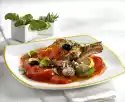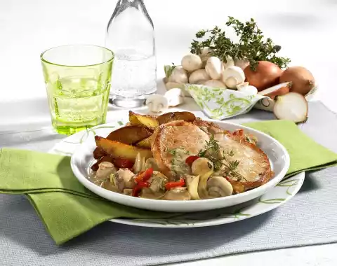 Wash the meat, dab dry and season with salt and pepper. Heat 1 tablespoon of oil in a large pan. Fry the meat for approx. 4 minutes, turning it over. Remove the meat, add the onion, mushrooms and tomatoes to the hot frying fat.