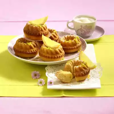 Bake in the preheated oven (electric cooker: 200 °C/ convection oven: 175 °C/ gas: level 3) for 20-25 minutes. Let the cakes rest in the moulds for 10 minutes. Then turn out of the ramekins and let them cool down on a cake rack. Dust with 6 g diabetic sweetener. Decorate with lemon wedges, grated lemon peel and lime peel if desired