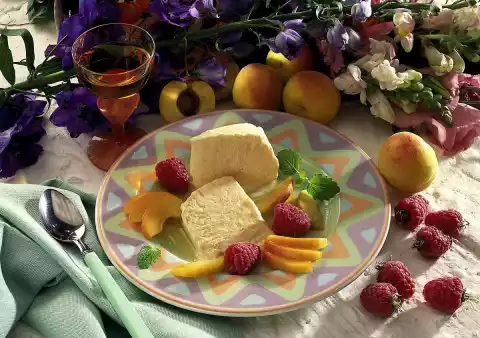 Stir vigorously several times in between. Cut remaining apricots into slices. Sprinkle with sugar, sprinkle with liqueur and leave to stand for approx. 30 minutes. Sort the raspberries. Let the ice cream thaw a little and turn out of the bowl. Cut into small cake pieces and arrange on plates with raspberries and marinated apricots. Serve garnished with lemon balm leaves
