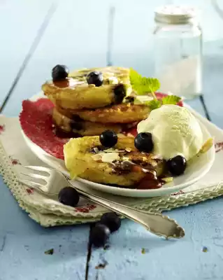 Fry over medium heat for about 3 minutes on each side. Keep warm. Bake the rest of the dough in the same way, adding the rest of the clarified butter in portions. Arrange the pancakes on plates, put 1 scoop of vanilla ice cream on each, sprinkle with maple syrup.