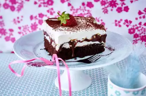 Preheat oven (electric cooker: 175 °C/ circulating air: 150 °C/ gas: see manufacturer) Grease square springform pan (24 x 24 cm) and dust with flour. Mix flour, 25 g cocoa and baking powder. Beat the eggs, 1 pinch of salt and brown sugar with the whisk of the mixer until thick and creamy.