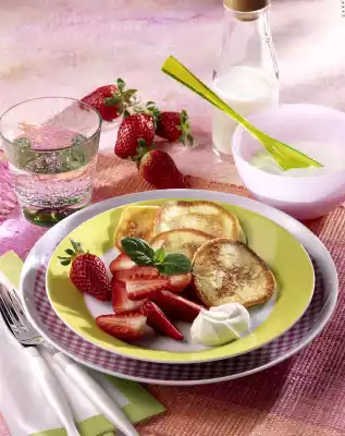 Heat the coated pan and brush with oil. Bake 4 cakes from the dough in it, golden brown on each side. Arrange the hot cakes with strawberries and curd cream
