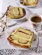 Warm up the jam and stir until smooth. Spread apple rings with jam. Dust with icing sugar. Add a dash of crème fraîche.