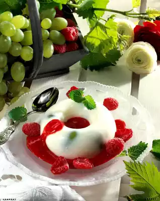 Heat the squeezed gelatine in a pot (do not boil) while stirring continuously, carefully stir into the buttermilk, fill into the moulds and refrigerate for approx. 4 hours. Put half of the raspberries aside, puree the remaining raspberries, remaining sugar and vanilla sugar. Turn out the jelly and arrange on four plates with raspberry puree and raspberries. Serve decorated with lemon balm as desired