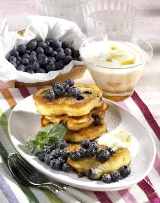 Dust the pancakes with icing sugar and serve with the yoghurt and the remaining blueberries. Decorate with mint.
