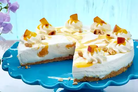 Remove the cake from the mould. Dice the rest of the peach. Whip 200 g cream until stiff and fill into a piping bag with a large star-shaped spout. Spray cream tuffs onto the cake and decorate with the rest of the purée, peach and almonds.