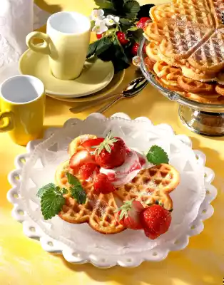 Fold in jam in "streaks". Chop strawberries finely. Coat waffle iron with a little oil and preheat. Put about 2 tablespoons of dough in the middle of each waffle iron and bake. Bake a total of 8 waffles. Arrange the waffles with some curd cheese and strawberries