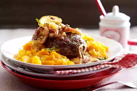 Drain the pumpkin vegetables, add 3 tablespoons of oil and mash everything with a potato masher. Season to taste with salt, nutmeg and lemon juice. Serve the puree and meatballs with apple and onion rings.