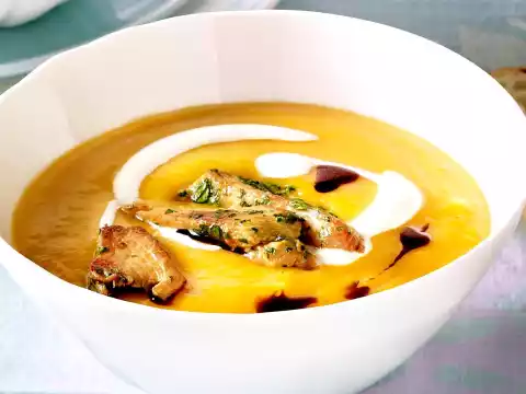 Season soup to taste with salt and pepper and arrange in bowls. Spread chicken strips over the soup. Garnish with coconut milk and possibly pumpkin seed oil. Baguette tastes good with it.