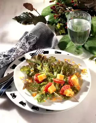 Clean, wash and drain the salad and pluck into bite-sized pieces. Peel carrots and cut into small cubes. Cut cheese into cubes, cabanossi diagonally into thin slices. Put one cheese cube and one sausage slice each on a small wooden stick. Mix vinegar, 1 tablespoon of water, salt and pepper, add oil and season to taste. Mix the salad leaves and carrot cubes with the sauce and divide it between 4 plates. Place the cabanossi skewers on top
