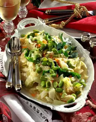 Onions peel and quarter. Clean, wash and cut the soup greens into small pieces. Cover and cook onions and 3/4 of the soup greens in 3/4 litre boiling salted water for about 1 hour. Then pour through a sieve. Meanwhile peel and wash the beans and cook them in boiling salted water for about 15 minutes. Clean, wash, quarter and cut the white cabbage into strips. Heat the oil in a casserole.