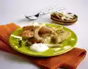 Season with salt, pepper, paprika and sugar. Add sauerkraut and cabbage, deglaze with mushroom water and 500 ml water, bring to the boil, cover and braise over medium heat for about 1 1/4 hours. In the meantime peel and wash the potatoes and cook in salted water for about 25 minutes. Heat milk and butter. Wash parsley, shake dry, put a leaf aside for garnishing. Cut the rest of the parsley into fine strips. Drain the potatoes, mash them with a potato masher and let the crème fraîche and milk-butter mixture run in. Season to taste with salt and nutmeg. Mix the cabbage casserole once again and season with salt, pepper, sugar and paprika. Arrange the cabbage goulash casserole in a bowl. Add a dash of crème fraîche and sprinkle with paprika and parsley. Garnish with parsley leaf. Add mashed potatoes