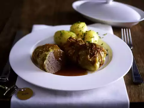 Place 2 cabbage leaves slightly overlapping on top of each other and place 1 chopped dumpling in the middle of each. Fold the sides of the leaves towards the middle and roll them up firmly. Wrap the roulades with thread and tie them up.