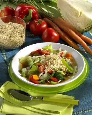 Bring to the boil covered and simmer for about 10 minutes. Then cook on low heat without lid for about 20 minutes. Season with salt, pepper and stock. In the meantime, let rice swell in boiling salted water according to package instructions. Drain and add to the soup