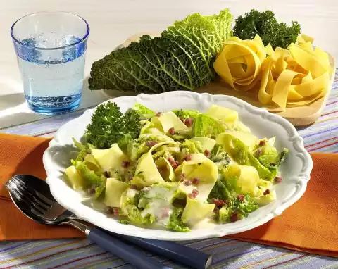 Cook the pasta in boiling salted water according to the instructions on the packet. Wash the parsley, dab dry and chop finely, except for a little to garnish. Drain the pasta and fold into the cabbage. Season to taste with salt and pepper.