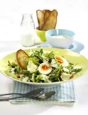 Bacon is crumbling. Grate half of the Parmesan cheese, and slice the rest into thin shavings with a peeler. Mix yoghurt, lemon juice, grated parmesan and 1 tablespoon of oil. Peel the garlic and press it directly into it. Season to taste. Mix yoghurt-knobi dressing and salad loosely. Halve eggs and arrange on top. Sprinkle with bacon and Parmesan shavings. Garnish with ciabatta croutons
