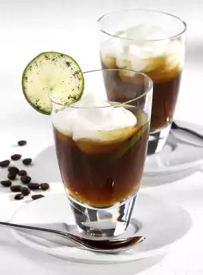 Mix coffee and icing sugar well, then refrigerate. Add rum and lime juice and fill into glasses. Whip the cream and distribute carefully with a spoon. To decorate, dust the edges of the lime slice delicately with coffee powder and place it on the edge of the glass.
