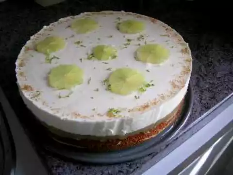 As decoration you can spread lime zests and filleted lime slices on the cake, sprinkle the edge with cane sugar.