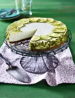 Carefully remove the cake from the springform pan, place it on a cake plate and press the pistachios onto the cake edge. Drain the lime slices well and place them on the surface on the edge of the cake.