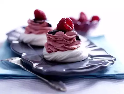 Spray the cream onto the meringue shells. Dribble chocolate sauce over the tartlets, decorate with a raspberry, eat immediately.