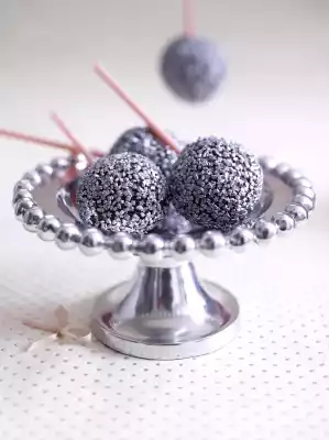 Add spread, rum and chocolate and knead well. Form 30 balls of the same size from the mixture. Turn into glittering sugar. Sprinkle with a few stars as desired. Press a lolly stick into each ball. Put the balls in a cool place for about 1 hour.