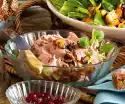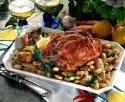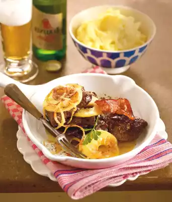 Meanwhile wash the liver, dab dry and turn it in 4 tablespoons of flour. Heat 1 tablespoon of oil in a frying pan and fry the liver for 2-3 minutes on each side. Season with salt and pepper. Serve with apples, onions and bacon. Garnish. Serve with ## mashed potatoes##