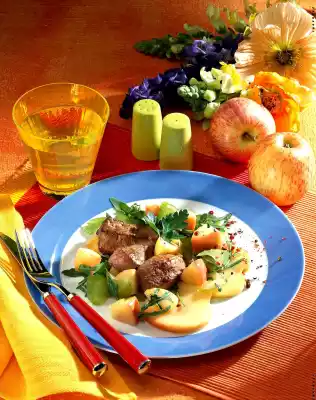 Fry in hot oil while turning for about 4 minutes. Season with salt and pepper. Melt the fat. Steam celery and apple pieces for 3-5 minutes. Fold in rocket. Season with coarsely ground pepper. Serve everything garnished with prepared apple slices and parsley.