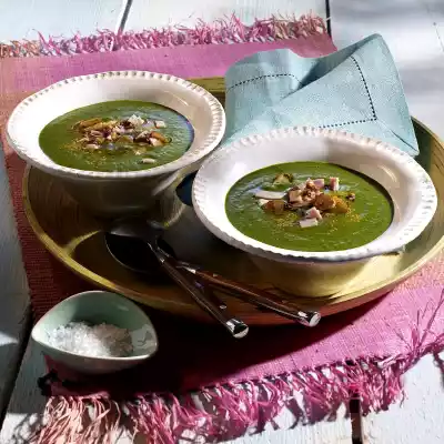 Finely mash the vegetables. Season soup with salt, pepper and nutmeg. Arrange everything. Spread garlic and ham on top. Sprinkle with curry.