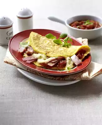 In 2 cups whisk 2 eggs and 2 tablespoons of cream. Season with salt and pepper. Heat 1 tablespoon of oil in 2 pans. Pour whisked eggs into the pan and let them fry at medium heat. Spread 2 tablespoons of tomato sauce, 1/4 ham and 1/4 mozzarella on 1 half of each omelette. Season with some marjoram and pepper. Fold the remaining omelette halves over the top