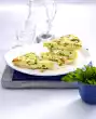Mix breadcrumbs and pistachios. Whisk the egg, season with salt and pepper. Cut cheese into 12 corners. Turn the corners first in the flour, then in the egg and finally in the breadcrumbs. Press the breadcrumbs