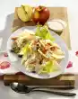Wash the cucumber, dab dry and cut into thin slices. Peel and quarter onions. Roast pine nuts in a pan without fat, remove. Heat 2 tablespoons of oil in a frying pan and fry the camembert pieces in it until golden brown.